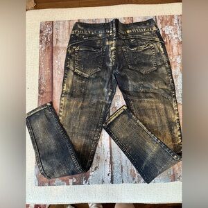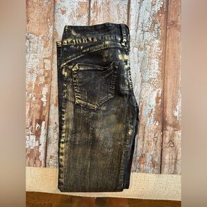 Sleek black jeans with striking gold accents. Perfect for adding flair to any outfit. Sprayed Gold look . Can’t tell if gold or copper New with tag retail is $99