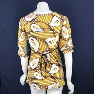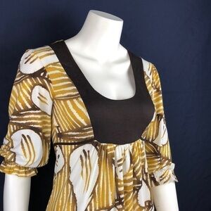 Chocolate brown yolk and thin tie at the back. The gathered yolk below is very forgiving at waist line. Three quarter adjustable sleeves with soft elastic at the opening. Lovely color combo.