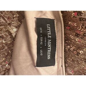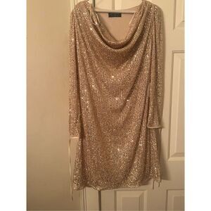 Get your sparkle on wearing the LITTLE MISTRESS Aimee Dress that makes a statement. Cowl neckline and three-quarter sleeves. Short-length silhouette. Pull-on style. 93% polyester, 7% elastane;Lining: 100% polyester. Hand wash. Great for a New Year’s party! Size 10. 39 inch bust from a smoke free home