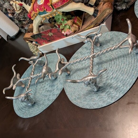 Vintage Arthur Court cast aluminum stands featuring a longhorn steer or bull design instead of the more common bunny rabbit motif.