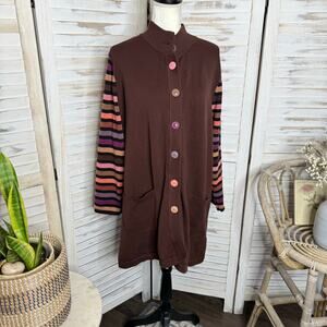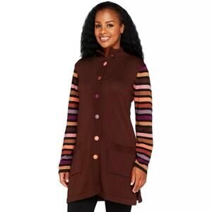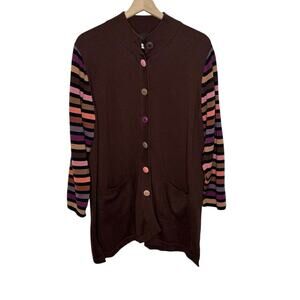 - BOB MACKIE Women’s PLUS SIZE 1X Rainbow Stripe Sleeve Long Button Sweater Jacket Brown -