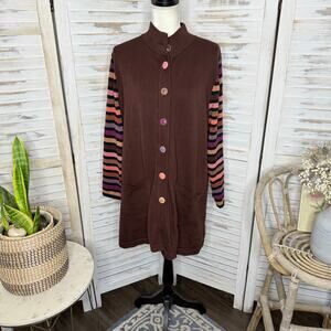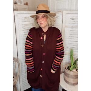BOB MACKIE Women’s 1X Rainbow Stripe Sleeve Long Button Sweater Jacket Brown NEW