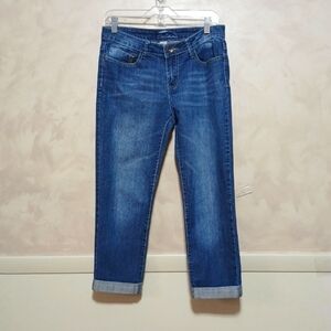 cotton blend fabric with stretch nice conformable material in a size 2 measurements w 16 i.s. 23 L 32 rise 9 rolled up cuffs are sewed in condition slightly used