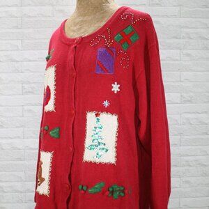 BOBBIE BROOKS Cardigan Christmas Knit Sweater Holiday Ugly Patchwork Red XL