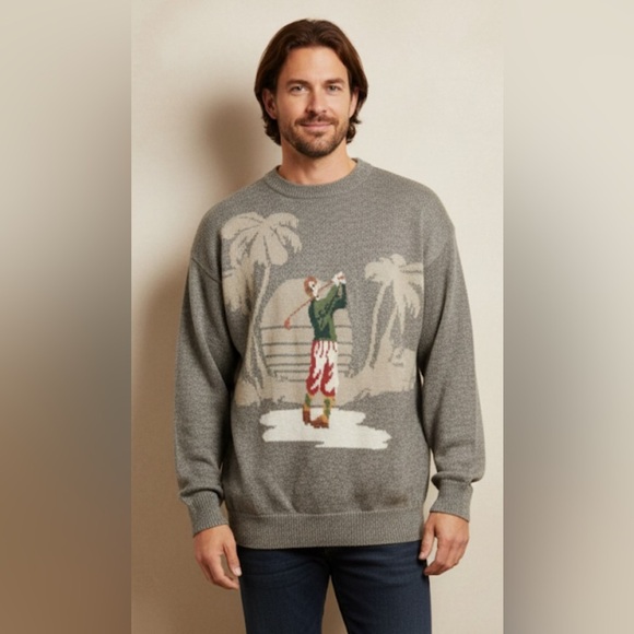 The BOBBY JONES Vintage Cotton Hand Intarsia Knit Golf Golfer Crewneck Sweater is a stylish and unique piece perfect for both casual and party occasions. Made from breathable cotton knit fabric, this pullover sweater features a classic crew neck and long sleeves, making it ideal for the winter, fall, and spring seasons. The green color and vintage design add a touch of nostalgia, while the USA, 90s, and sports themes give it a distinctive charm. Ideal for golf enthusiasts, this sweater is designed for comfort and style, with a regular fit that is easy to wear.