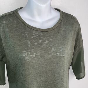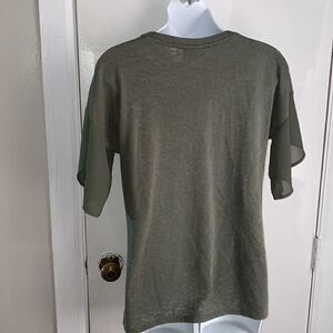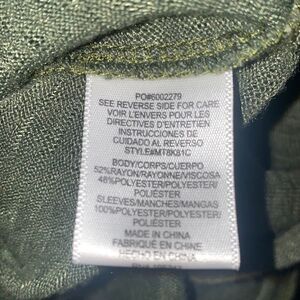 Washable rayon polyester blend in an olive green with a burnout effect, polyester split flutter sleeve detail. Washable. Size medium (size tag cut off), measures 19” from armpit to armpit and 25” from top of shoulder to bottom hem.