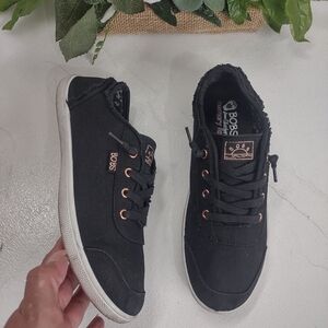 Casual black canvas sneakers with frayed edges. Comfortable and stylish for everyday wear.uded excellent condition