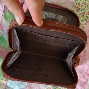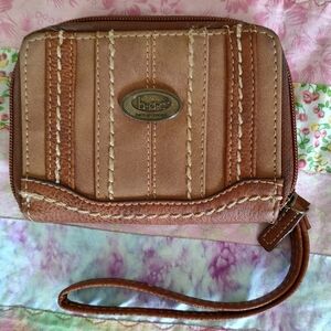 BOC BROWN VEGAN LEATHER THREE ZIPPER WRISTLET. The faux leather is flawless and inside immaculate. One zipper pull has a couple of stitches come loose that a shoe professional can cheaply fix. For the price it would be worth it!