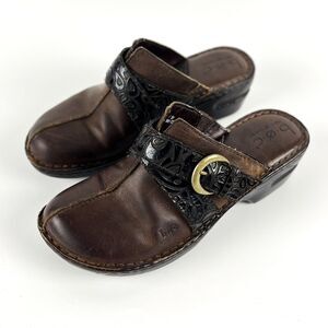 BOC Born Concept Brown Clogs wedge heel brass buckle Accented with intricate tooled Design on black straps SZ 8