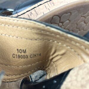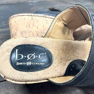 Up for sale is one(1) pair of BOC Born Concept Womens Zee Sandal 10M Black Leather Wedge Heel Platform Slide