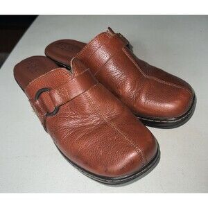The product is a pair of Born Concepts slip-on clogs in size 9, featuring a casual style perfect for everyday wear. Made with leather in a brown color, these comfortable shoes are cushioned for added support. With a medium width and easy slip-on closure, they are ideal for women looking for a stylish and practical footwear option. The brand, Born, is known for its quality craftsmanship and attention to detail, making these mules a reliable choice for casual occasions.