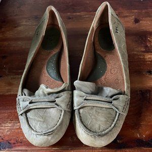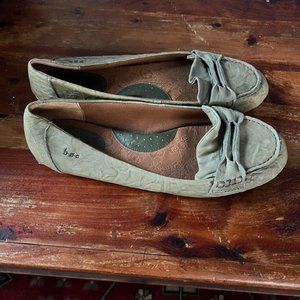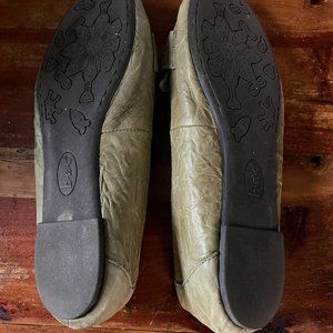 Ladies size 10 (US). Muted green leather with rubber soles. In great shape, a few years old but have been stored in a plastic shoe box. Worn a few times - they're cute but hurt my feet! Not recommended for wide feet or long toes.