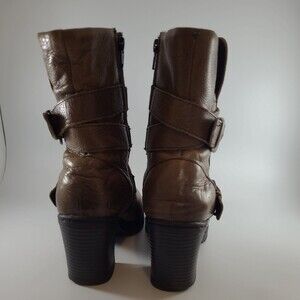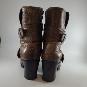 BOC Josephine Boot Lug Sole Buckle Strap Heeled Leather Brown Women's sz 8 Euro 39 Boho or biker style Small scrap in heel pointed out by green arrow. Heel has some wear see pictures.