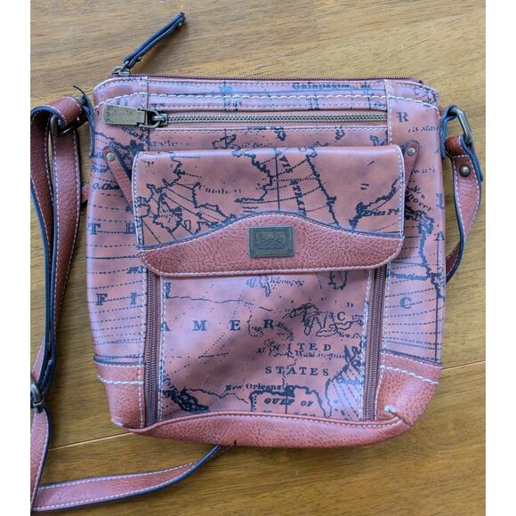 Vintage BOC faux leather crossbody in light brown/tan with printed map design and brass hardware.