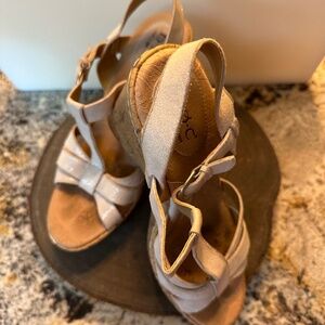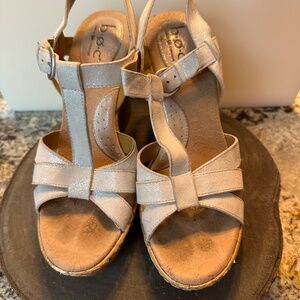 BOC Wedge Heel Sandals with Silvery White Leather Straps. Size 10. Worn a few times and shows some wear, but still very cute with lots of wear left.