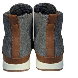 Stylish gray fabric ankle boots with plaid lining — cozy, lightweight, and perfect for cooler weather. The soft exterior and simple slip-on design make these booties easy to wear for casual outings, travel, or everyday errands.