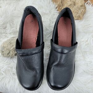 Black clog style shoes. leather. Preloved condition. All sections of interest as well any known flaws have been documented in the photos and noted as thoroughly as possible. if there are no known flaws, none will be noted. Please feel free to ask any questions before purchase 🙂. Great comfort shoes and more