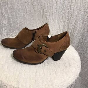 Cognac brown monk strap buckle short heeled booties. Pre-owned in good condition. Please refer to pictures for best description and condition verification. Size 7.5.