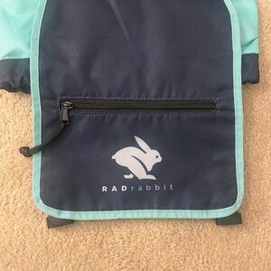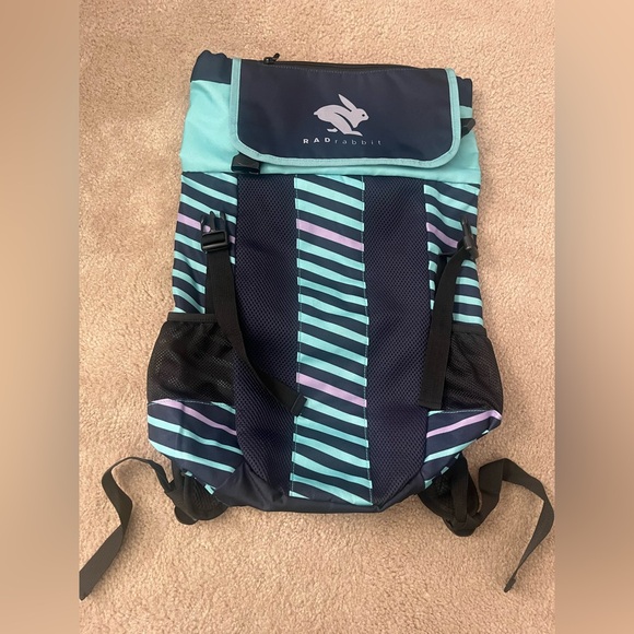 BOCo Rad Rabbit backpack with turquoise blue and purple stripes. Two mesh side pockets, zippered internal and external pockets with adjustable front straps and padded back straps. Stash all your bulky gear, pull the strap and securely fasten with a click. No marks or wear.