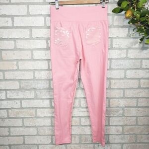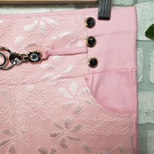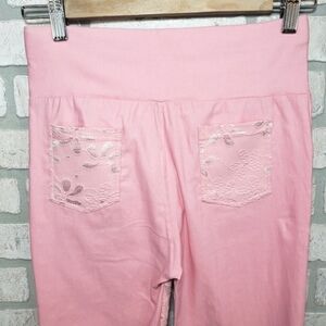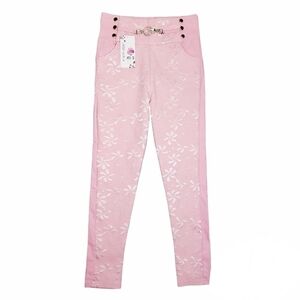 The pants have a floral lace overlay in front with 2 front pockets, a buckle and button accents, with 2 back lace pockets as well, with soft stretch material. Excellent condition. *NEW*