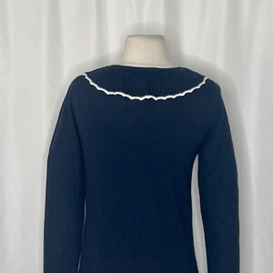 Wide frilled collar the neckline … the collar has a texture to the knit ~ Long sleeves ~ Button closures all the way down the front ~ Straight hemline ~ Soft unlined cotton/wool blend knit fabric ~ Navy blue with white trims at the edge of the collar, ends of the sleeves and hemline