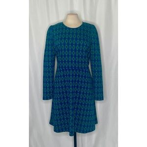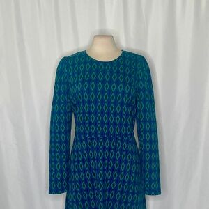 Rounded neckline ~ Long sleeves with puffed shoulders ~ Nipped at the waist ~ Skirt has a full A-line shape ~ Two inset side/seam pockets ~ Straight hemline ~ Knee to below knee length ~ Concealed back zipper closure ~ Soft unlined jacquard knit fabric … fabric has some light stretch ~ Diamond pattern in green, blue & black