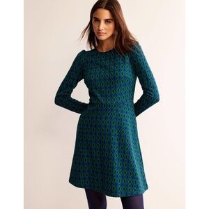 BODEN Jacquard Knit Atlantic Azure Diamond Print Dress Puff Sleeves Size 16 18