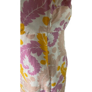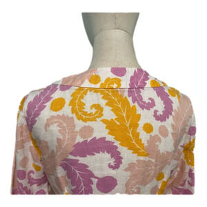Linen lovers pay attention to this lovely linen sheath mini dress with a high waist and an A-line skirt with an unusual side zipper. The pattern is cheery paisley pattern on white, shades of light and darker pink, gold and lilac. VGC Size 2