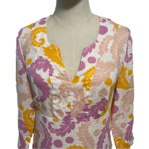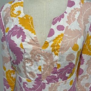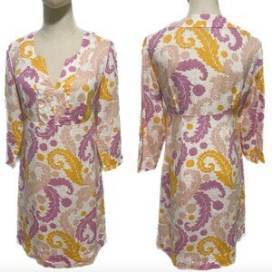 BODEN LINEN BOHO V-NECK WHITE, PINK & GOLD 3/4 SLEEVE SHEATH VGC SZ 2