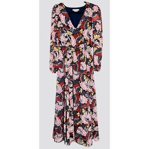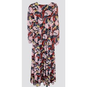 Crafted from high-quality chiffon material and machine washable, this dress is made to last. The dress is a size 6P, perfect for petites, and the long dress length is perfect for a boho, NWOT look. The dress comes in a rust, autumn, navy, yellow, and pink mix, making it a versatile addition to any wardrobe.