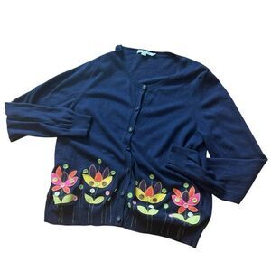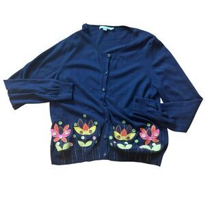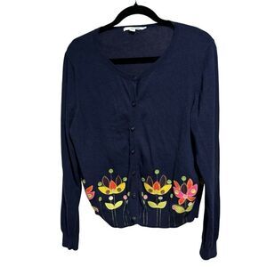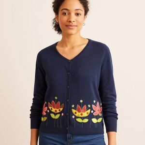 BODEN Navy Blue Floral Embroidered Cotton Cashmere Button-Front Cardigan Sweater