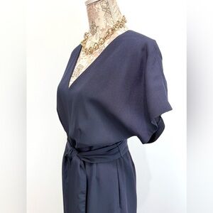 Navy blue flutter sleeve V neck wide leg crop jumpsuit from BODEN, size 6R. Has keyhole button back closure and tie waist.