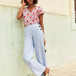 These lightweight trousers are 100% linen and 1000% chic. The wide-leg shape flatters the figure and is ideal for balancing out fitted tops. Button detailing on the side adds a smart slant – ideal for transitioning from post-siesta cocktails to late-evening meals on holiday.