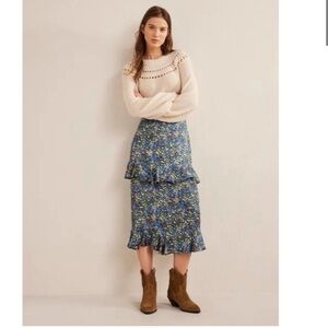 Step into effortless style with this charming Boden floral midi skirt. Crafted from a lightweight fabric, this skirt features a beautiful blue floral pattern that exudes a fresh, feminine vibe. The design is accentuated by a tiered ruffle hem, adding a playful touch to your outfit. Perfect for both casual and semi-formal occasions, this skirt pairs wonderfully with a cozy sweater and ankle boots for a chic, bohemian look or with a crisp blouse for a more polished ensemble. Comfortable and versatile, this Boden skirt is a must-have addition to your wardrobe.