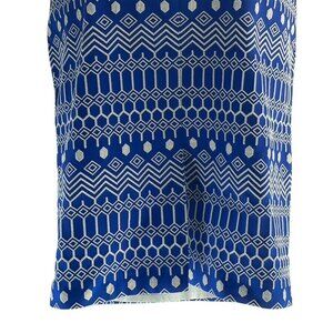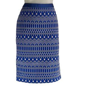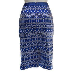 This knee-length pencil skirt features a striking blue and white geometric pattern. Designed to complement a professional wardrobe, it's ideal for office settings. The high-quality fabric ensures a comfortable fit, while the back zipper closure offers ease of wear.