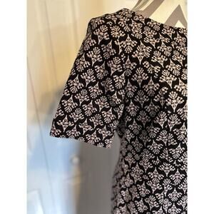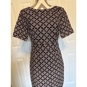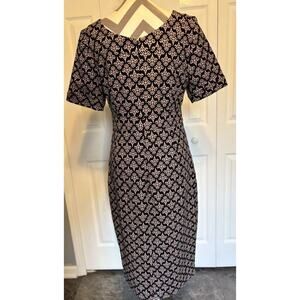 The dress is made from a jacquard fabric, which gives it a unique geometric pattern. It is a size 8 and has a zip closure. The dress is a great addition to any wardrobe, and its preppy and classic theme make it a perfect choice for any occasion.