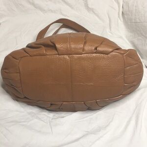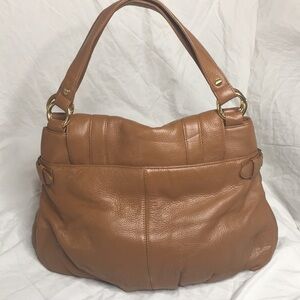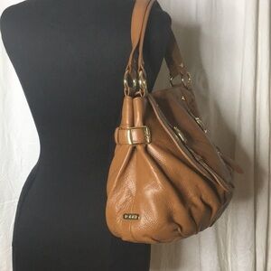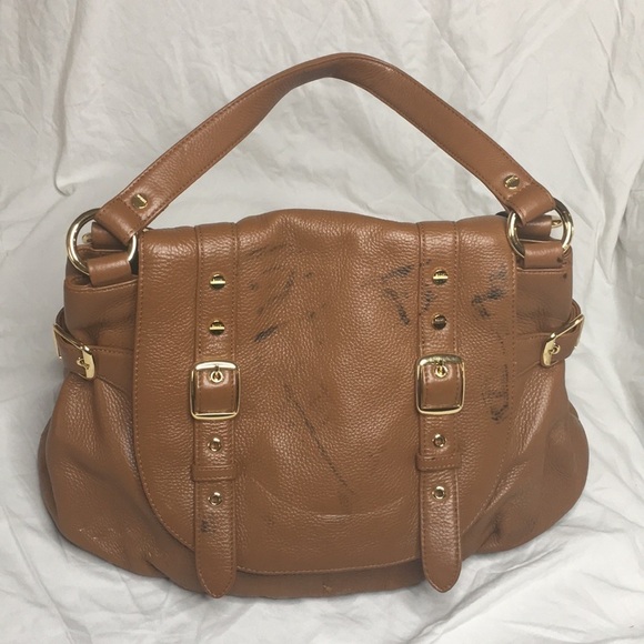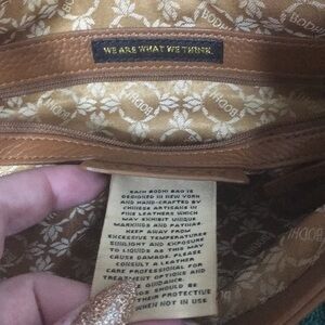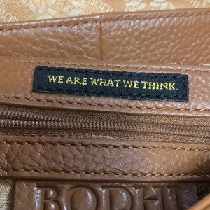 BODHI RICH LUXURIOUS THICK LUGGAGE BROWN LEATHER with gold hardware. Outside has large snap closure pocket an oven base with gathered leather and Belt and buckle detailing. Double flat leather handles. Flap closure. Inside is lined in gold BODHI Jacquard Fabric and has 1 zippered and 2 slip pockets. Does have some color transfer marks on front. Otherwise perfect condition