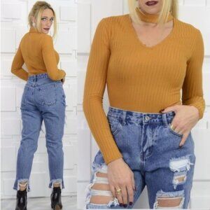 Bodysuits are all the rage right now! Comfortable and easy to pair with jeans/leggings or skirt this fabulous bodysuit featuring popular choker detail and ribbed texture. A season must have!!!