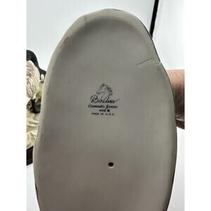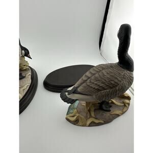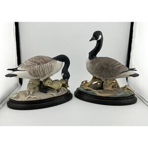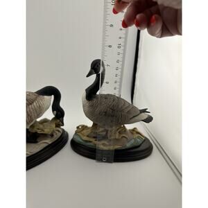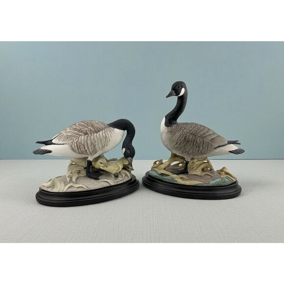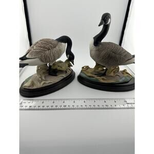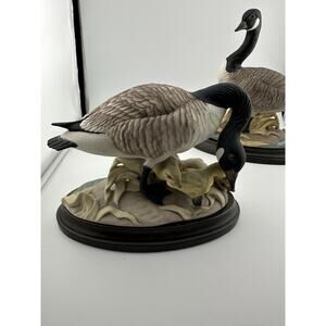 The BOEHM Canadian Geese Porcelain Figurines Set of Two with Stands from 1953 is a charming collection of medium-sized figurines featuring a 3D effect and hand-painted details. These vintage pieces showcase the 1950s style with a matte finish, and are signed by the brand Boehm. They are #408N and the female with chicks #408. The male is 7.5" x 6" x 3". The female is 4.75" x 6" 3". They weigh 3 lbs combined. The elegant design and multicolor accents make them perfect for any room in your home, adding a touch of nostalgia to your decor. Handmade in the United States, these figurines are a fixed edition and come with their original porcelain stands, making them a unique and collectible addition to your animal-themed display. They are excellent condition with no chips or damage.