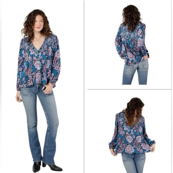 New With Tags Band Of The Free Josie Sapphire Mixed Print Long Sleeve Top. V neckline, floral print, loose fitting, retro boho flare.