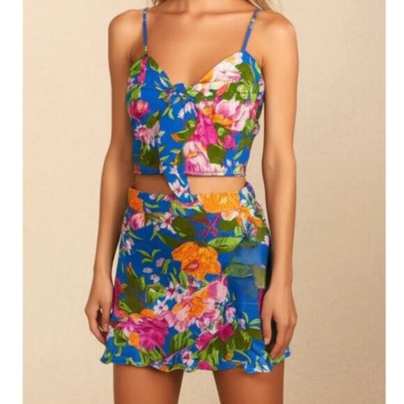This beautiful 2 piece set from B.O.G. COLLECTIVE is perfect for any casual occasion. The sleeveless tank top features a sweetheart neckline and is adorned with a vibrant floral pattern. The set includes a matching pair of shorts/skort that are perfect for any beach or tropical adventure.