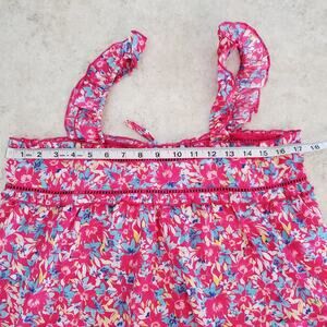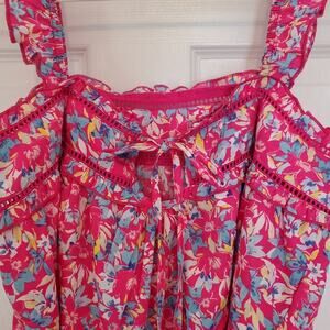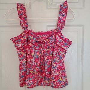 This lightweight hot pink floral tank has pretty ruffle trim and ties in the back.