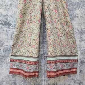 Wide leg silhouette with floral paisley-inspired all-over print and contrasting border print at the hem.