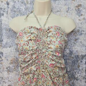 Features a ruched front bodice, adjustable halter neck tie, and elastic smocked back for a comfortable fit.