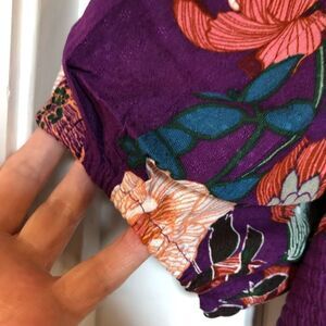 Band of Gypsies makes this Band of the Free “Aimee” Purple and Cream Floral Puff-Sleeve Mini Dress. It’s in ladies size MEDIUM. The quilted bodice is the focal point of this swingy dress, framed by the sweetheart neckline and puff sleeves. Smocked back and elastic sleeves. The shell is 100% viscose and the lining is 100% polyester. Hand wash in cold and hang to dry. The pit-to-pit measurement is 19”, the length is 36” and the sleeves are 12”. The waist circumference is 30” (without stretching). This is out of stock on the Band of the Free website. It couldn’t be cuter and it’s NWT! 🌸
