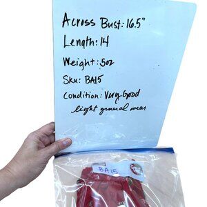 Light general wear noted. Across bust = 16.5 inches, length = 14 inches.