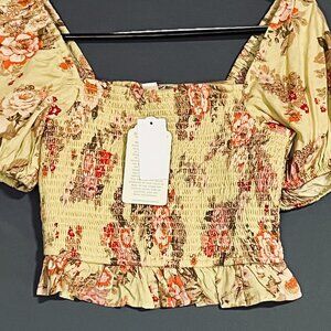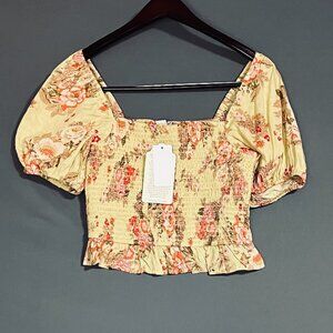 BOG Yellow Floral Boho Cropped Smocked Peplum Blouse Small Boho