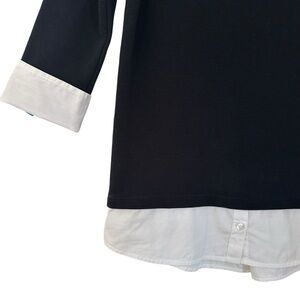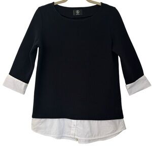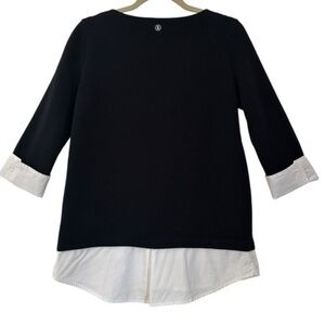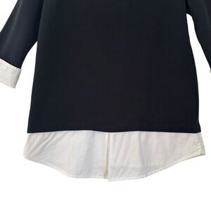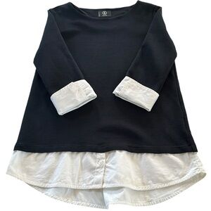 Bogner layered look top. An easy stylish go to item for a polished look. Featuring a thick ribbed black cotton top layer with a wide scoop neck and a classic white cotton shirt tail and cuff layer. Shirt tail has front buttons as do the cuffs. Sleeve length is 3/4.