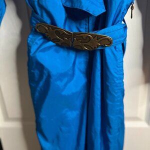Own a piece of skiing history with this vintage Bogner ski suit. The blue belted snowsuit, made in the United States, is a rare find for any skiing enthusiast. The size 12 regular fit is perfect for women who enjoy skiing, snowboarding, and sledding.