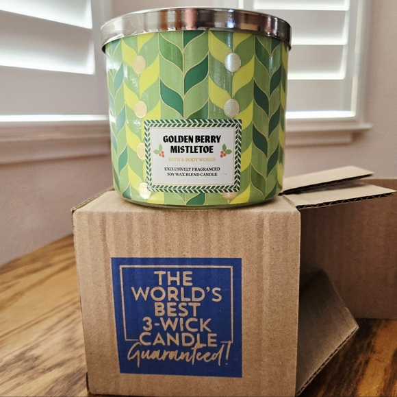 ππ―NWTβΌοΈ Bath & Body Works "Golden Berry Mistletoe" 3-wick Candle. Beautiful decorative lid. Fragrance notes of sparkling berries, sugared spruce, and frosted air.